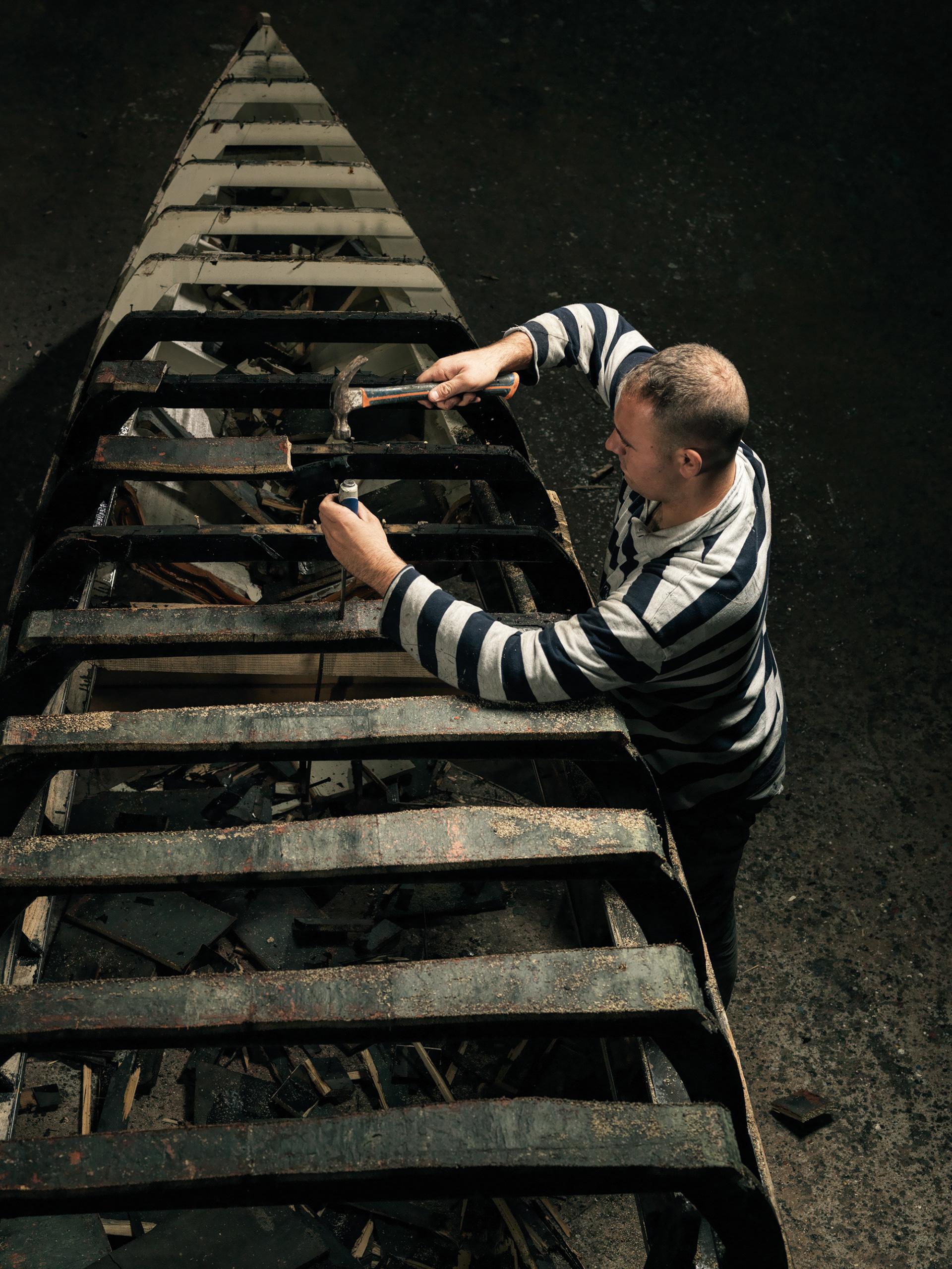 One of the most incredible procedure in the hundreds-years-old process of handcrafting Gondolas is the manual handling of the boat that is carefully put upside down with remarkable skills. Ancient holes in the ground are tailored to fit the two ends when the boat is facing downward, allowing a comfortable position of the boat to be further developed but also keeping it mechanically 'trapped' into a given torsion force.